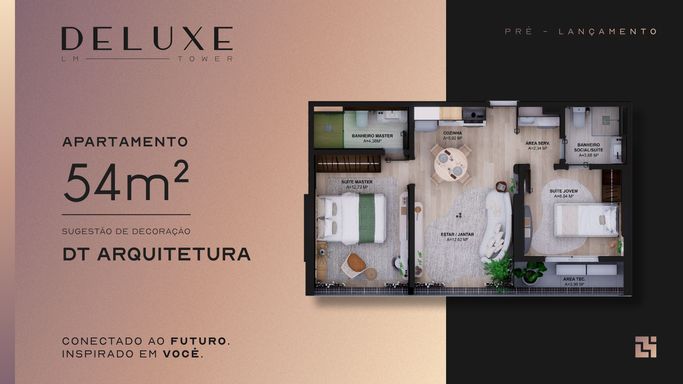Com 54m², esta tipologia oferece 2 suítes confortáveis, sala de estar/jantar com sacada espaçosa, cozinha prática, área de serviço e banheiro social.
